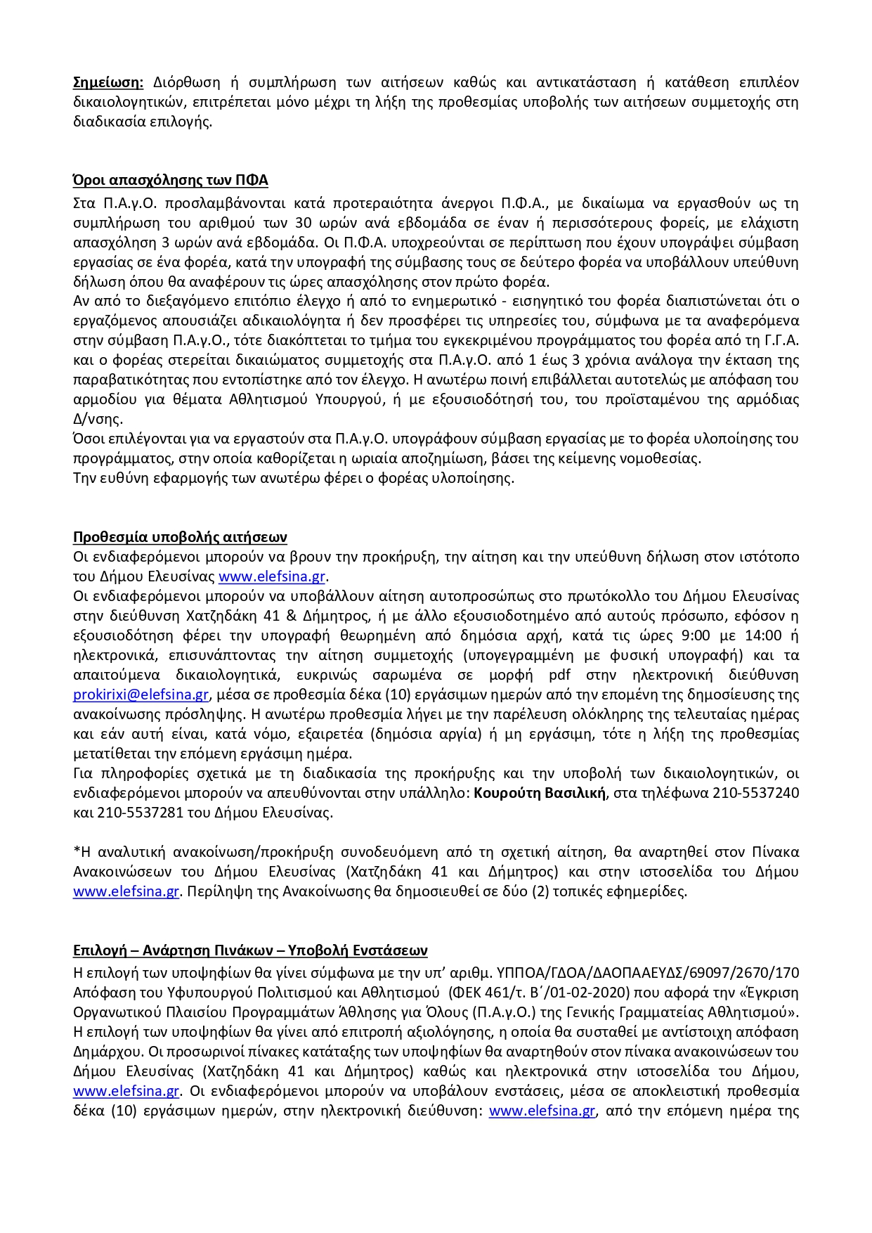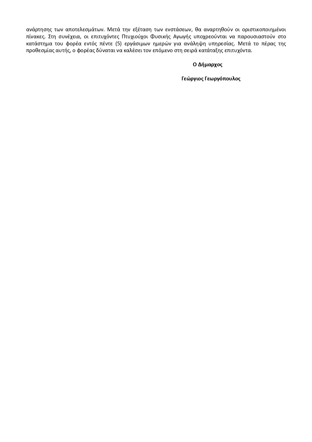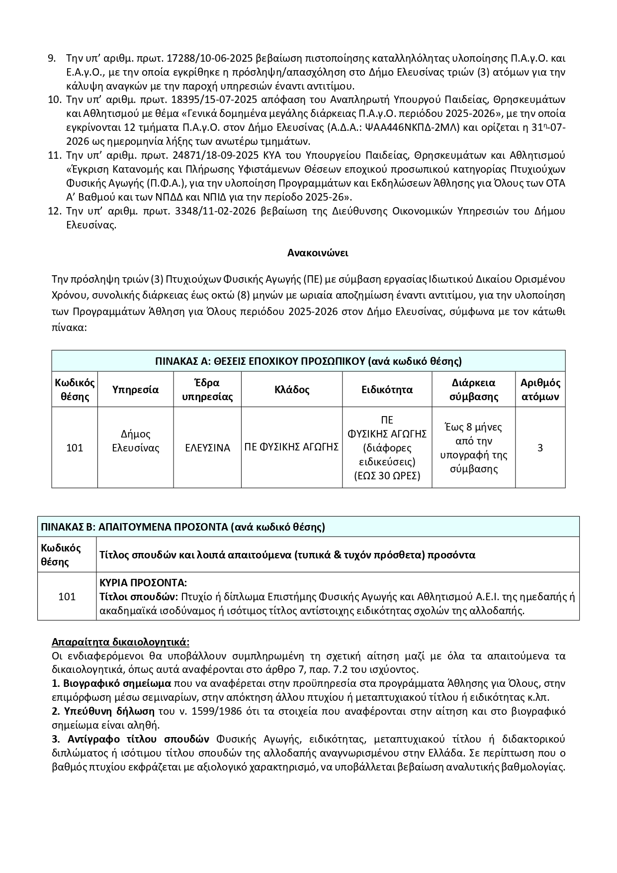 ΑΝΑΚΟΙΝΩΣΗ Για την πρόσληψη τριών (3) Πτυχιούχων Φυσικής Αγωγής (ΠΕ) με σύμβαση εργασίας Ιδιωτικού Δικαίου Ορισμένου Χρόνου (ωρομίσθια) έναντι αντιτίμου, διάρκειας έως οκτώ (8) μηνών, για την υλοποίηση των Προγραμμάτων Άθληση για Όλους περιόδου 2025-2026