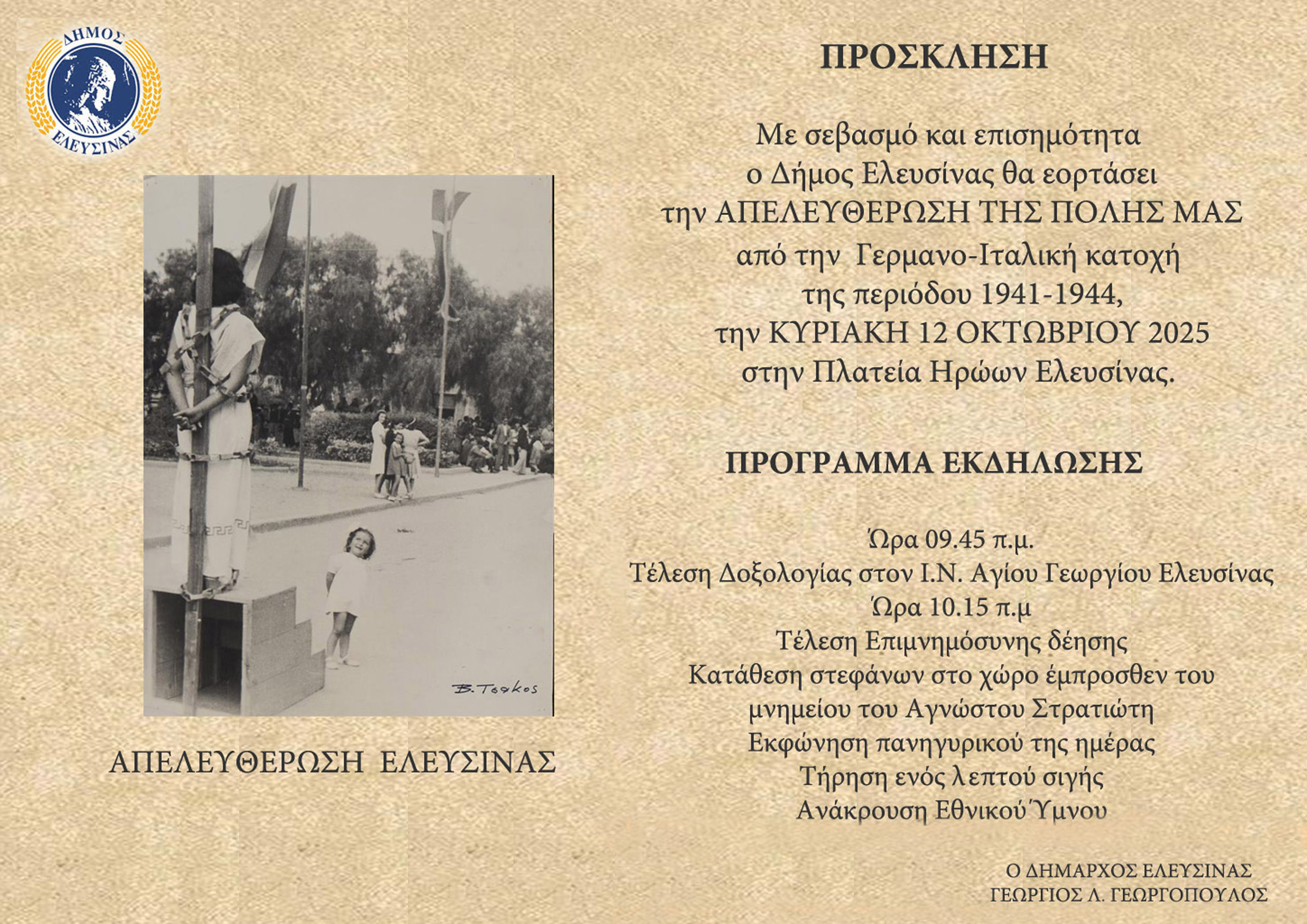 Πρόσκληση εορτασμού της Απελευθέρωσης της Ελευσίνας την Κυριακή 12 Οκτωβρίου 2025