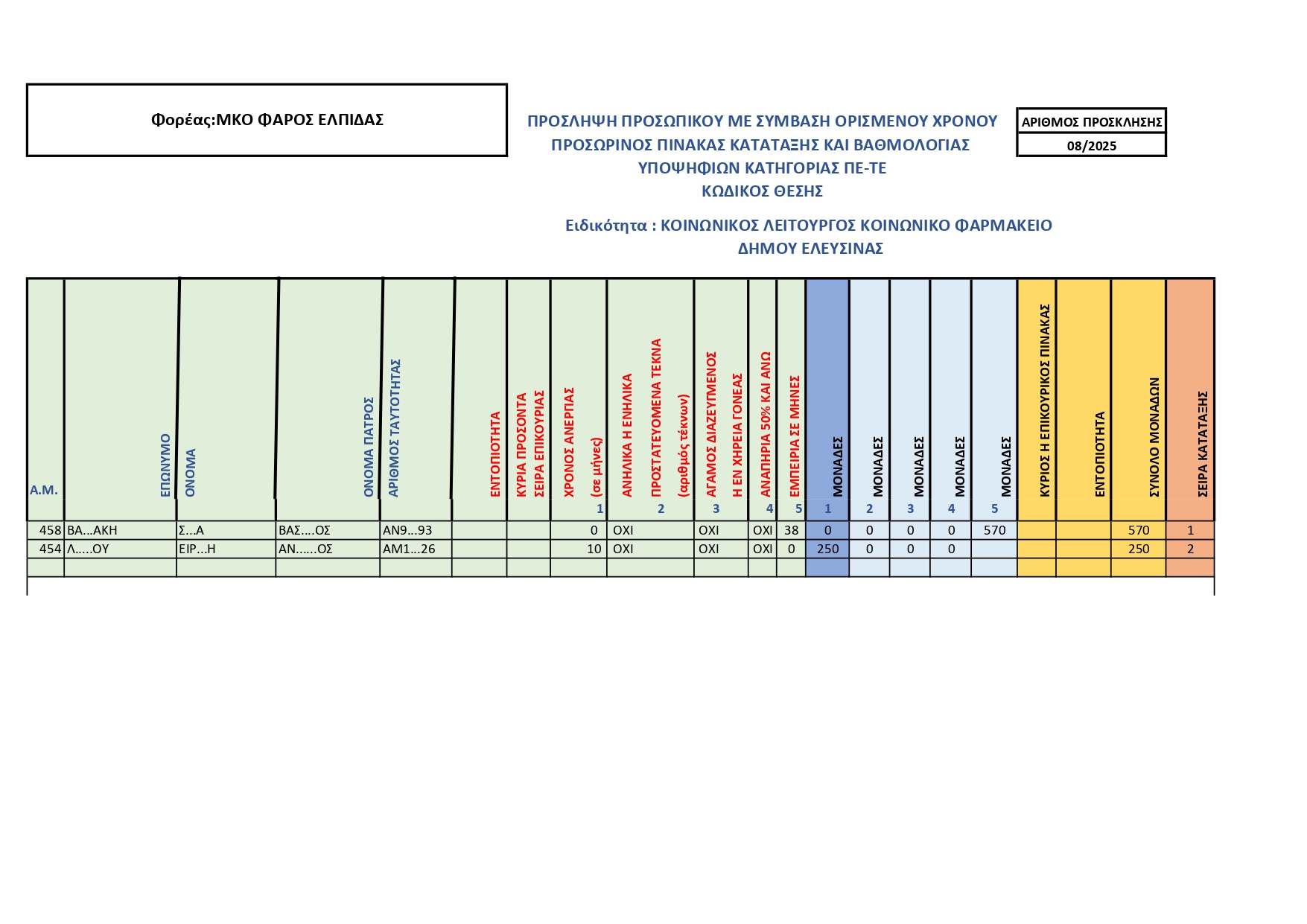ΠΡΟΣΩΡΙΝΟΙ ΠΙΝΑΚΕΣ ΠΡΟΣΚΛΗΣΗΣ 08/2025 ΤΗΣ ΠΡΑΞΗΣ ΣΥΝΕΧΙΣΗ ΔΟΜΩΝ ΠΑΡΟΧΗΣ ΒΑΣΙΚΩΝ ΑΓΑΘΩΝ: ΚΟΙΝΩΝΙΚΟ ΠΑΝΤΟΠΩΛΕΙΟ, ΚΟΙΝΩΝΙΚΟ ΦΑΡΜΑΚΕΙΟ ΣΤΟ ΔΗΜΟ ΕΛΕΥΣΙΝΑΣ » για την υλοποίηση του Υποέργου 2 «ΚΟΙΝΩΝΙΚΟ ΦΑΡΜΑΚΕΙΟ ΔΗΜΟΥ ΕΛΕΥΣΙΝΑΣ» με κωδικό ΟΠΣ 6002712.